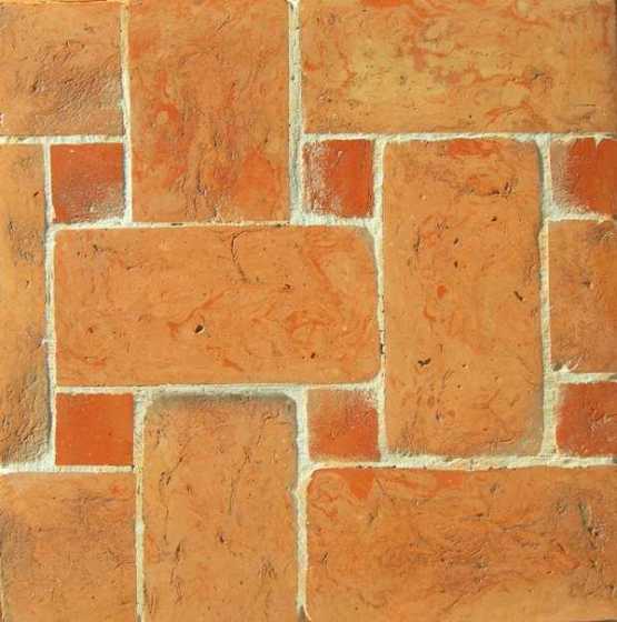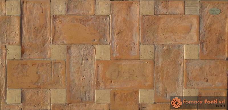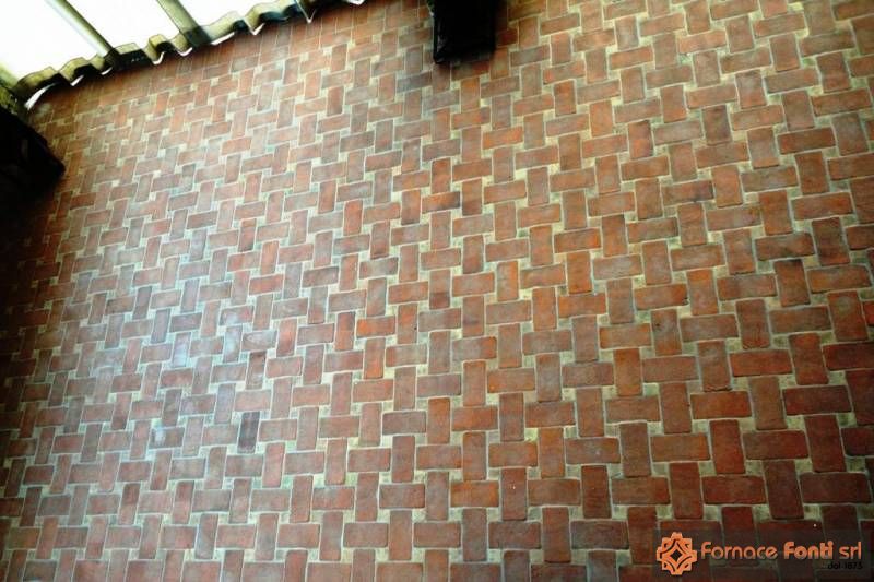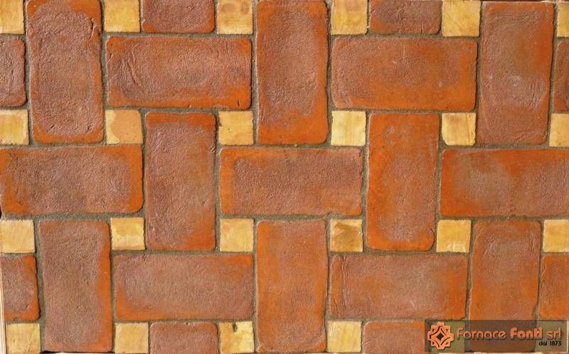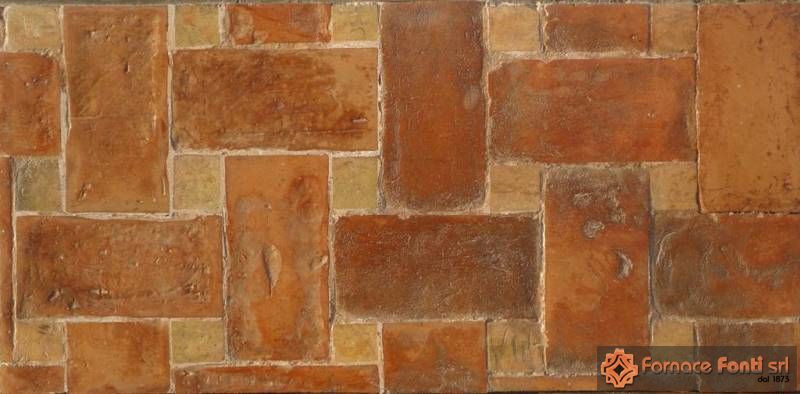 Pavimento in cotto stampato a mano con le stesse tecniche di una volta, con effetto stuoia. Cottura a carbone stonalizzata e preparato in modo da prendere le originali colorazioni naturali.