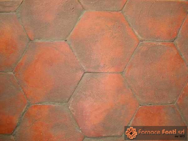 Pavimento in esagono, cottura a carbone stonalizzata e preparato in modo da prendere i vecchi trattamenti naturali.